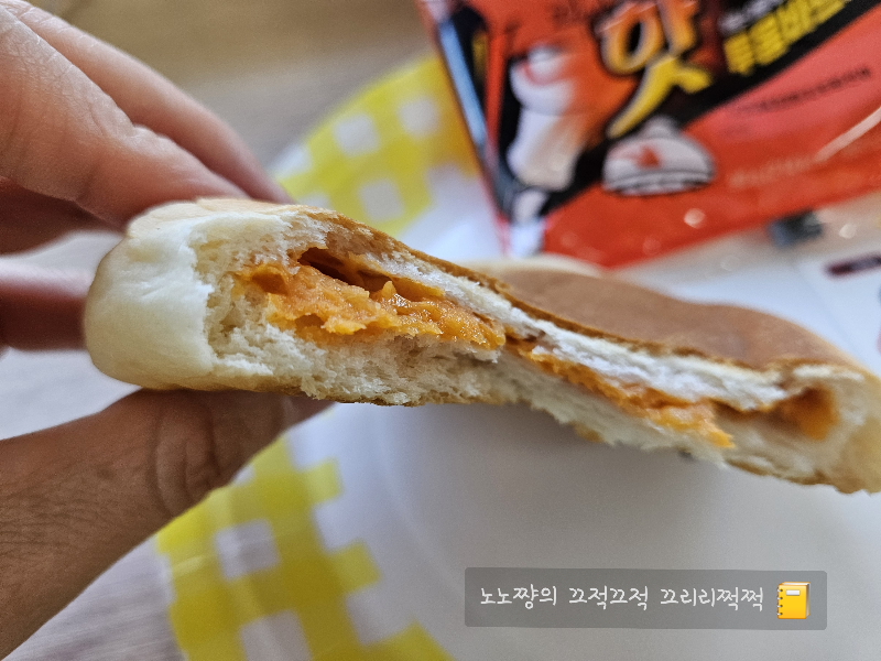 호떡 스타일로 눌려진 빵인데 빵도 적당히 부드럽고, 안쪽은 소스때문에 촉촉해서 찰져요.