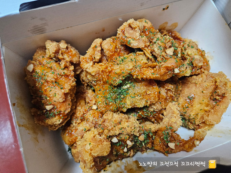 치킨 위에 소스가 드리즐되어 있고, 한입 베어물면 육즙이 풍부한게 굿!