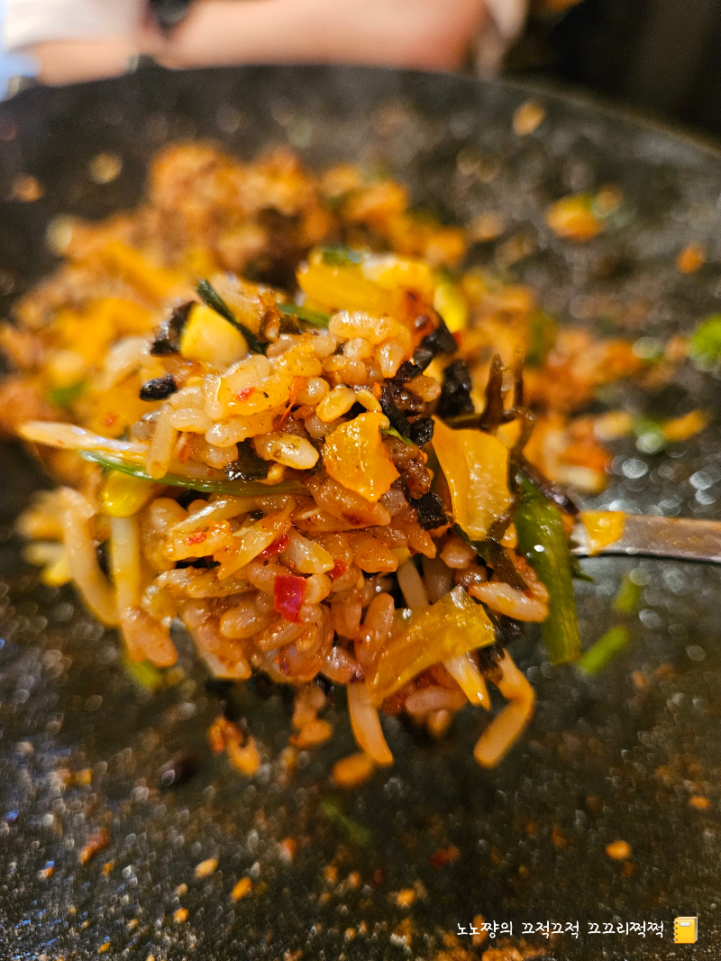 남은 곱창 기름에 콩나물, 부추, 김치, 김가루 등 각종 야채와 밥을 함께 볶아주면 고소한 풍미가 입안 가득 퍼져요.