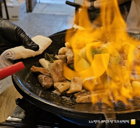 불쇼 덕분에 곱창은 겉은 바삭하고 속은 촉촉하게 완성돼,