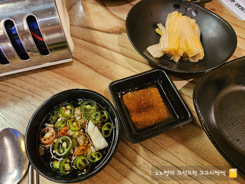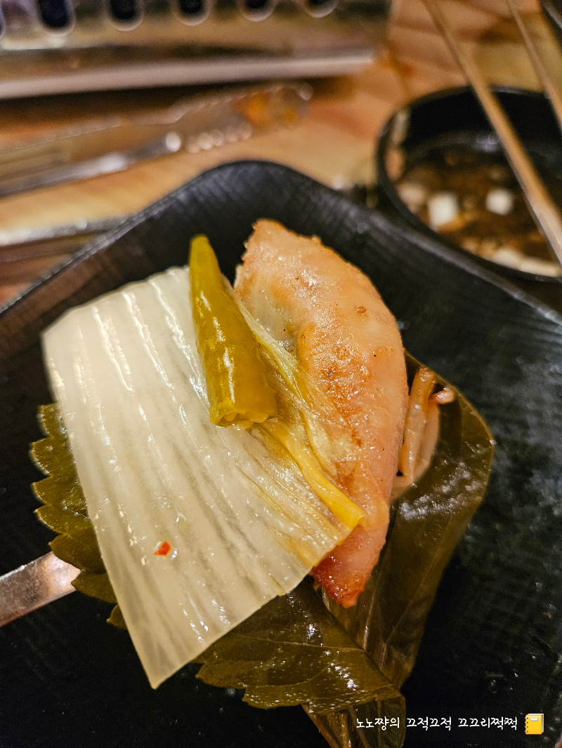 기본 반찬으로 나온 묵은지와, 깻잎장아찌에 싸서 먹으면