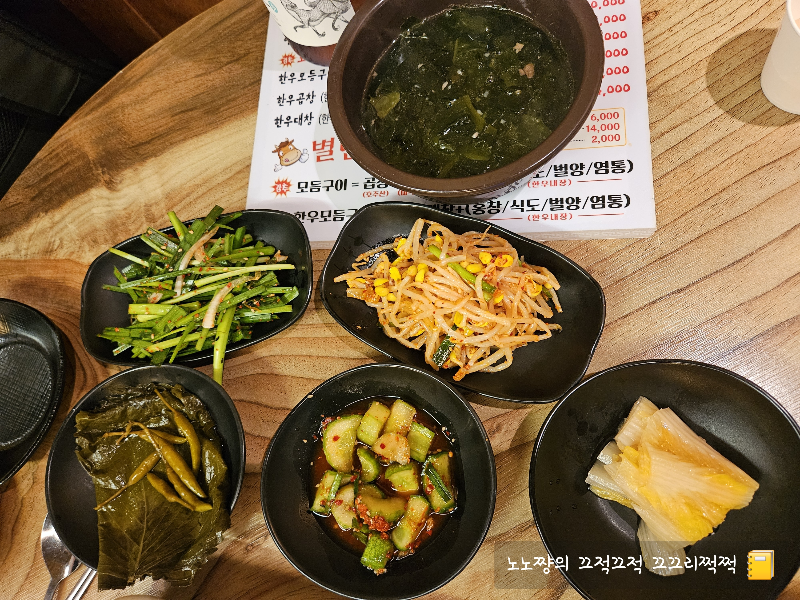 기본 반찬: 부추무침, 콩나물무침, 백김치, 오이김치, 깻잎장아찌, 미역국 등 다양하게 제공돼요.