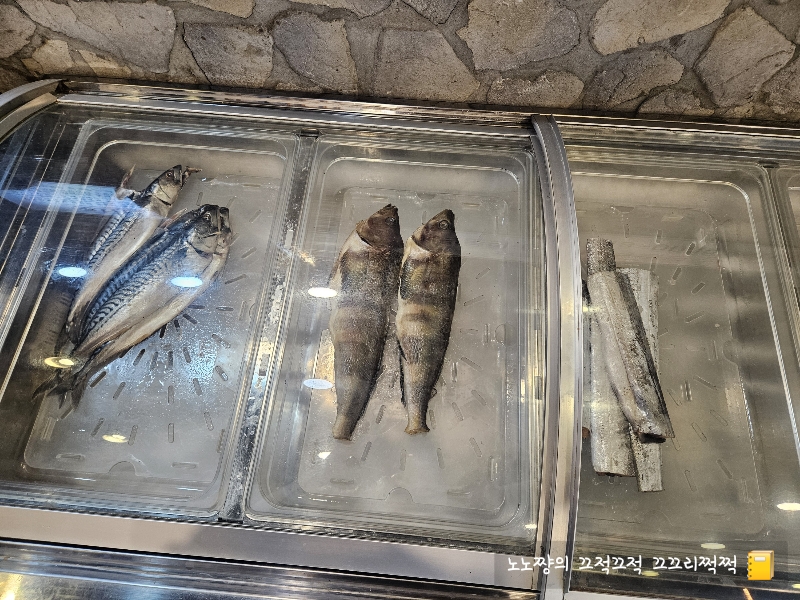 고등어, 임연수, 갈치가 투명 유리 냉장고에 정갈하게 진열되어 있어,